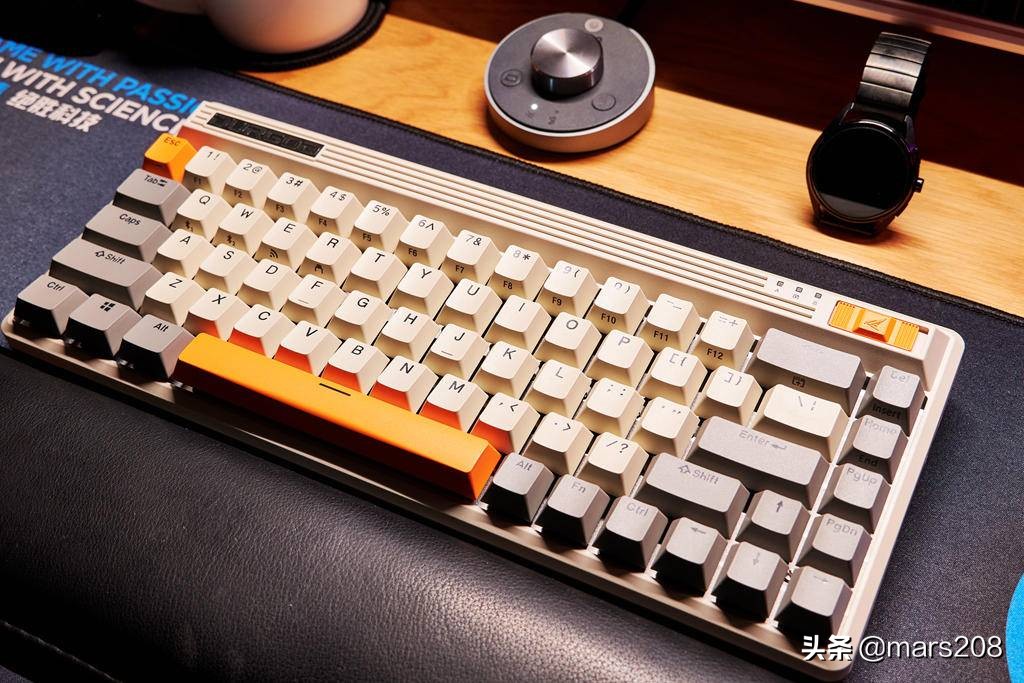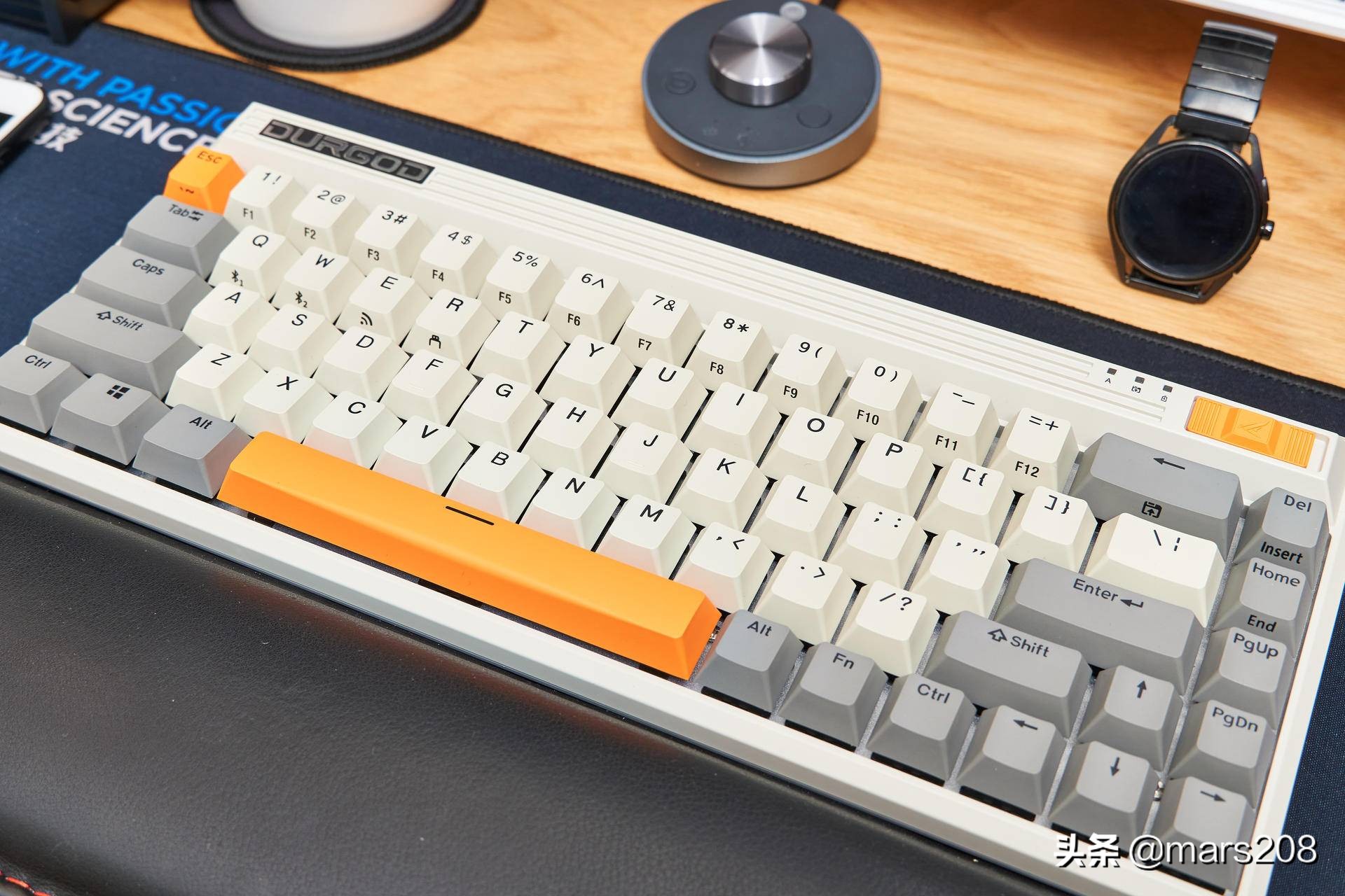 FUSION采用68键键位,重量部分仅为620克,是目前楼主用过最为小巧的键盘,橙、白、灰三色搭配复古怀旧,左上是DURGOD铭牌下隐藏有USB无线接收器,从右侧字母D处按压就可以取下这个磁吸铭牌,接着按压无线接收器就会弹出,算是一个兼顾了收纳和美观的彩蛋设计。