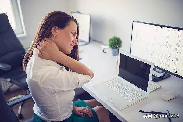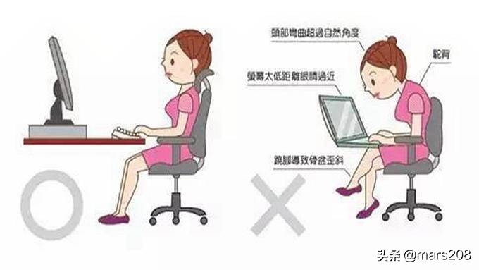 这其中有很大一部分是由于座椅不适合、电脑显示器放置高度过低导致的。座椅高度无法调整、靠背对于腰部支撑不够会导致坐姿不正确。而显示器过低的高度(普通显示器和笔记本显示屏大都如此),则会让你不自自主的低头探视,这就和低头看手机是一样的,导致的最终结果不言而喻。