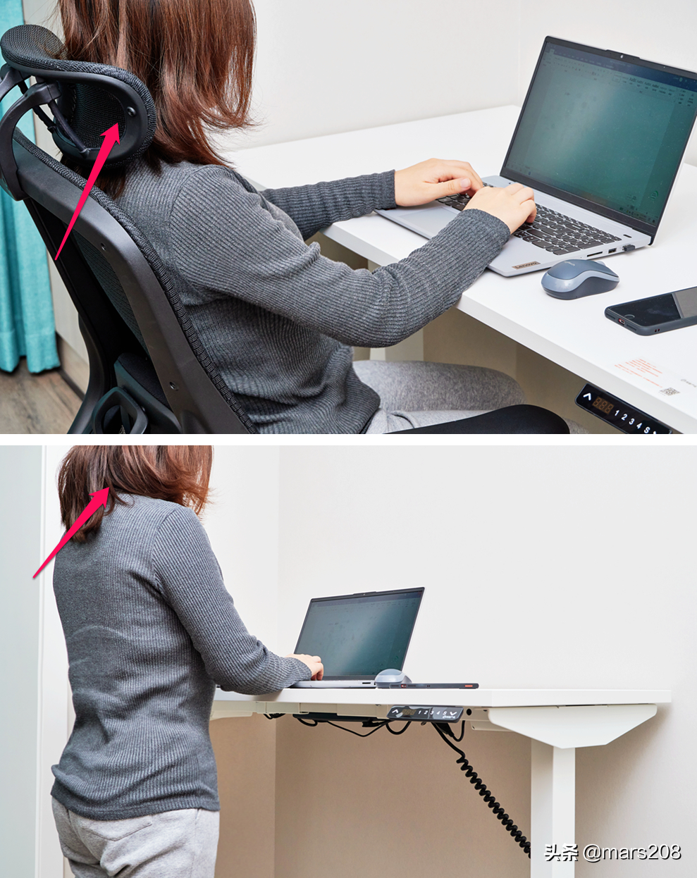 这就需要你将显示屏、座椅的高度调整到一个合适的状态,以保证自己的姿势正确,让自己的颈椎处于正常受力的舒适状态。